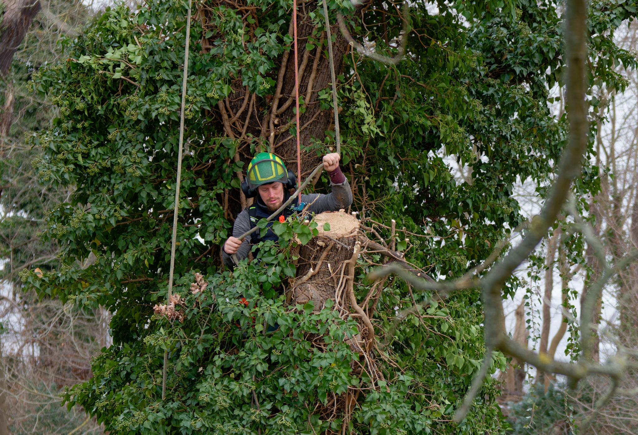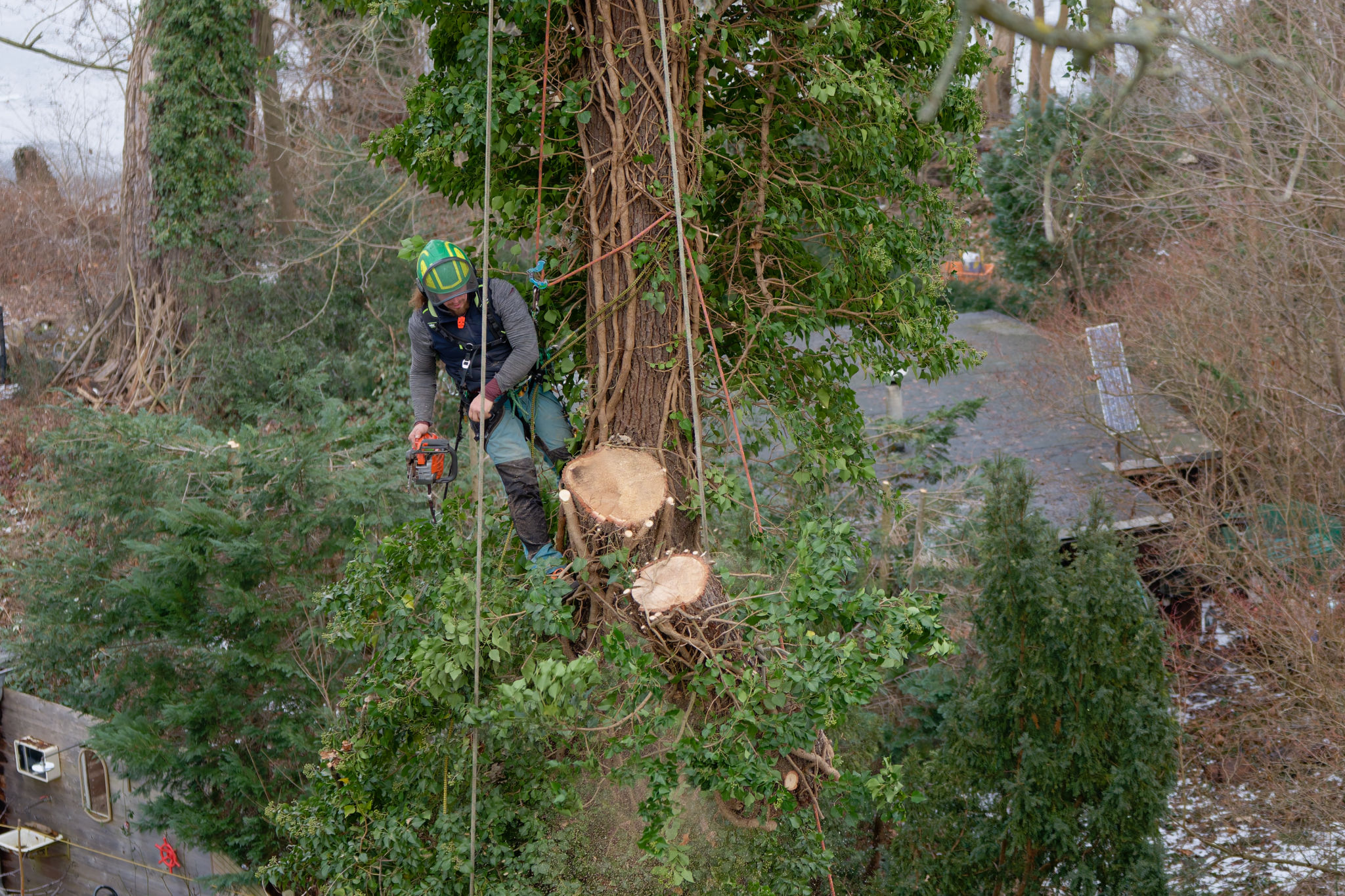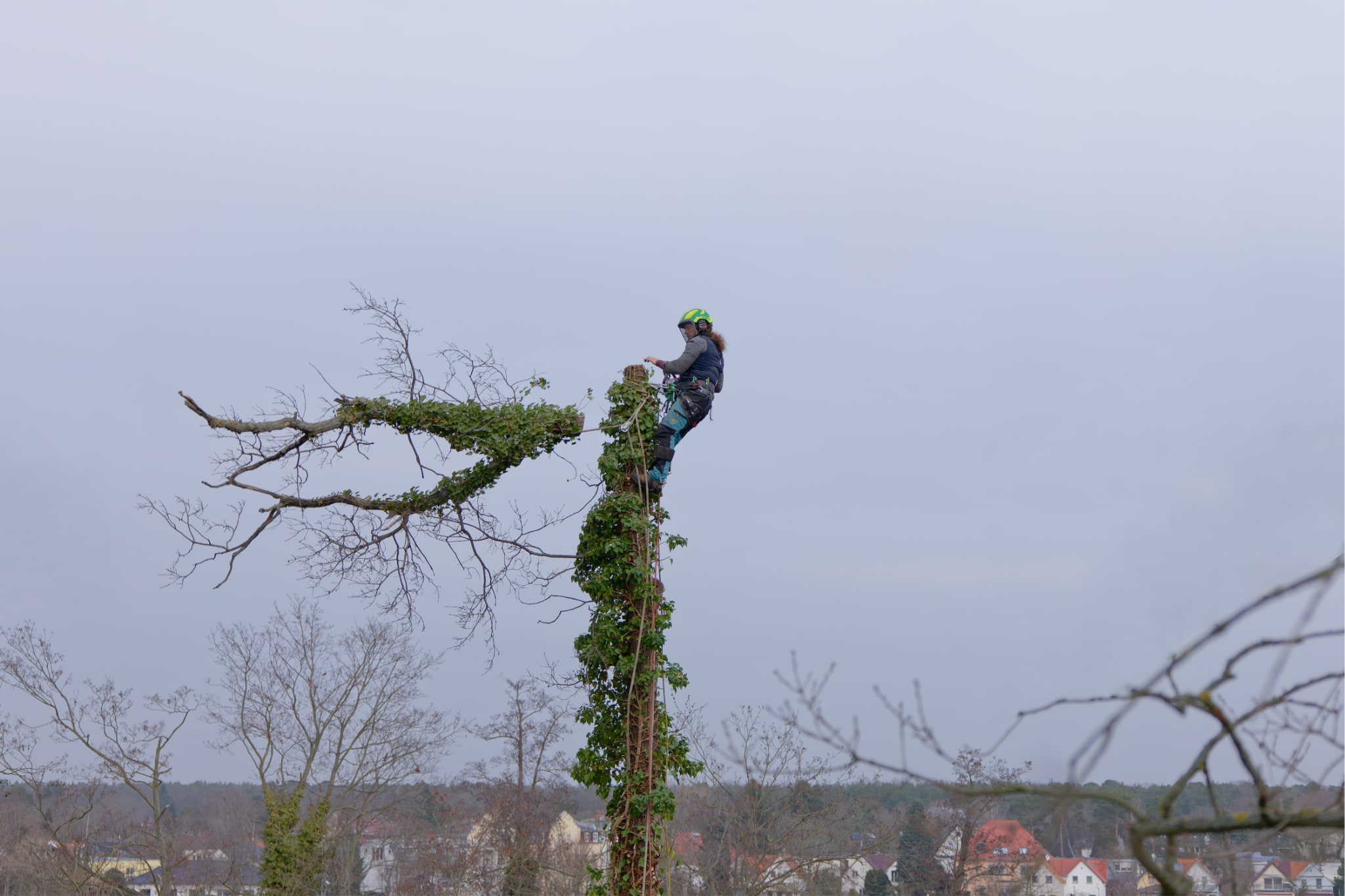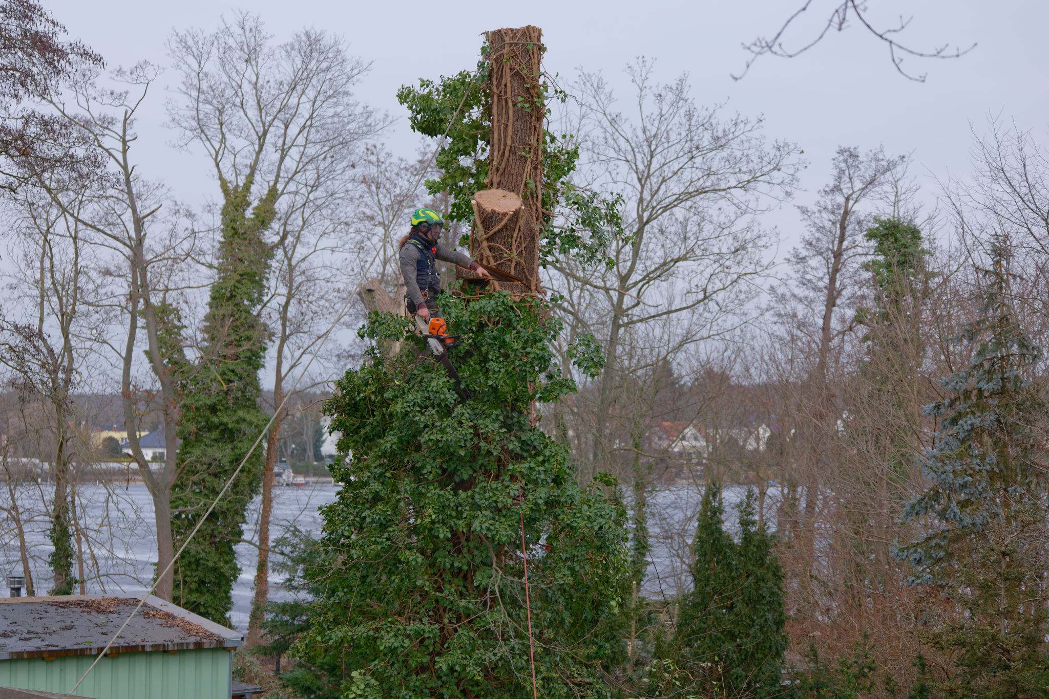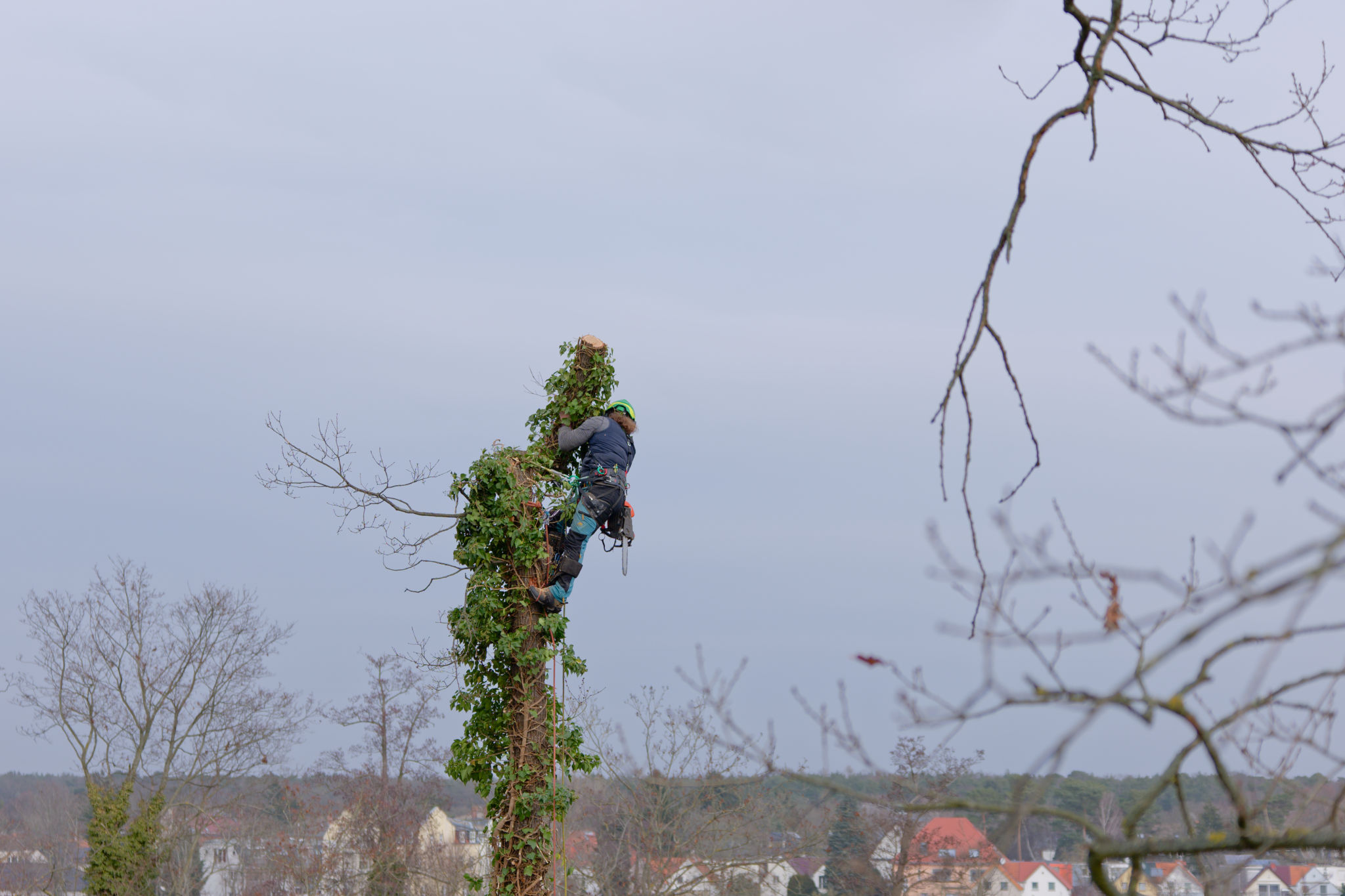 - Vorgehen: Baumklettertechnik + seilgestützte Stück-für-Stück-Demontage (Rigging, kontrolliertes Ablassen)