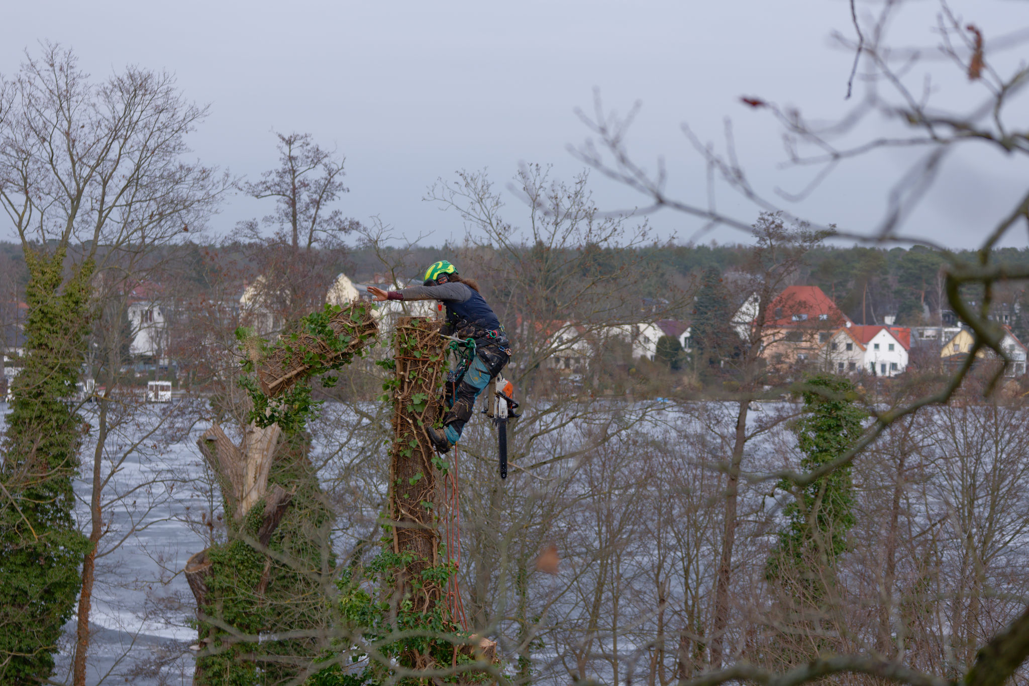 Auf der Insel Valentinswerder (Reinickendorf, Berlin) haben wir eine Hybridpappel (Populus × canadensis) fachgerecht entfernt. Der Baum war etwa 90–100 Jahre alt und rund 30 Meter hoch. Besonders herausfordernd war der Standort: Der Baum stand sehr nah am Haus, am Zaun und am Nachbarbereich. Da kein ausreichender Fallraum vorhanden war, konnte er nicht im Ganzen gefällt werden. Stattdessen war professionelle Baumklettertechnik und eine kontrollierte Demontage mit Seiltechnik erforderlich.