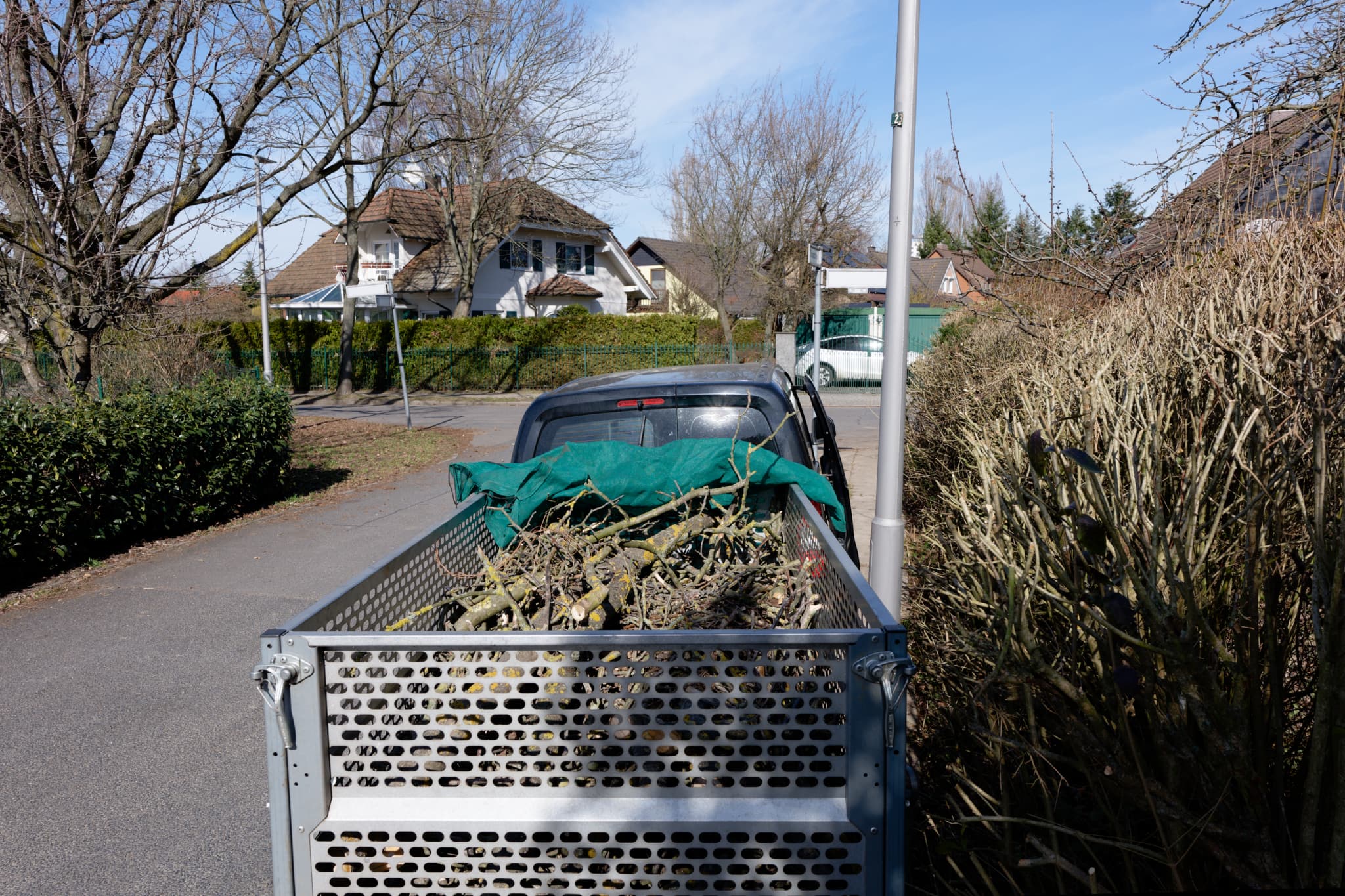 - Entsorgung: Sämtliches Schnittgut in den Anhänger verladen und abtransportiert, Boden gereinigt
